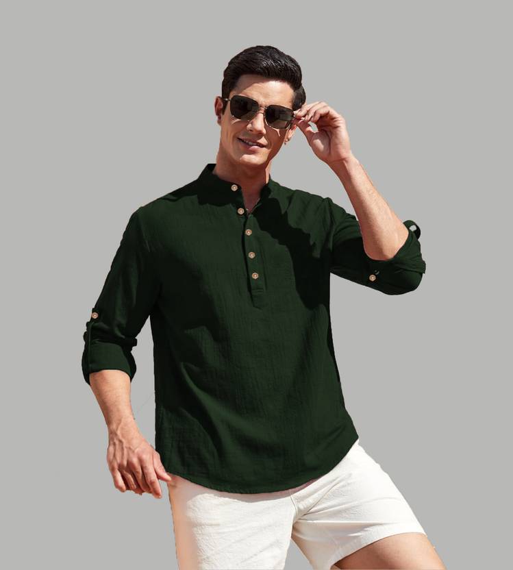 This pure cotton beige short kurta is perfect for men who value style and comfort. Its versatile design makes it ideal for any occasion—festivals, parties, or casual outings. Product Details ?? ????? Gender: Men ?? Pattern: Solid ?? Design Type: Plain ?? Closure: Button ?? Sleeve: Full Sleeve (Roll-Up Option) ?? Waist Rise: Mid-Rise ?? Collar: Mandarin/Chinese ?? Hemline: Curved ?? Fabric: Pure Cotton ?? Product Length: Short ?? Pack of: 1 Material & Care ?? Fabric: 100% Cotton Wash: Suitable for hand wash and machine wash. How to Style ?? Pair it with dark-wash denim or linen trousers for a casual look. Dress it up with a pair of churidar or slim-fit pants for festive occasions. Add leather sandals or loafers and a wristwatch for a classy finish. Roll up the sleeves for a relaxed vibe during daytime events. This short kurta seamlessly blends traditional elegance with modern styling, making it a wardrobe essential for every man! ??