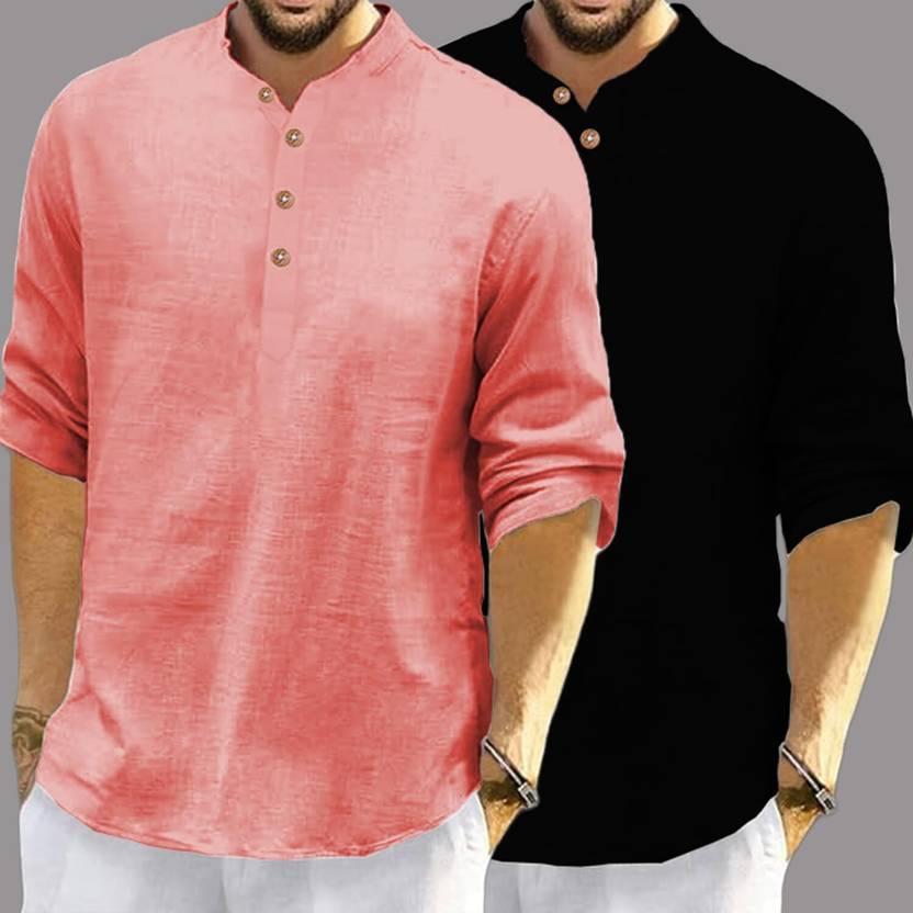 Vida Loca Pack of 2 Men Solid Cotton Blend Straight Kurta (Black, Pink)