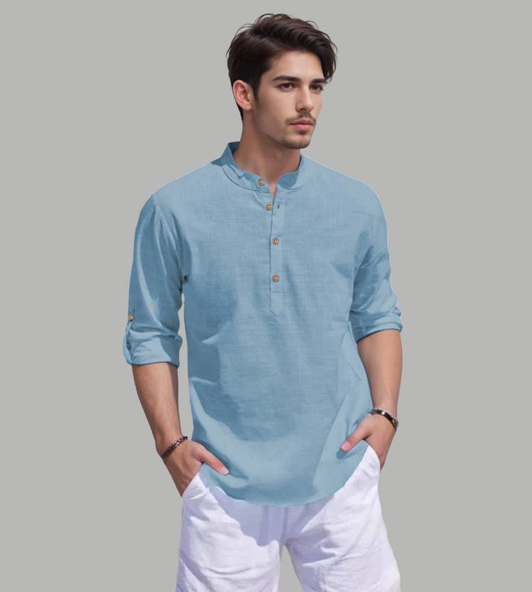This pure cotton beige short kurta is perfect for men who value style and comfort. Its versatile design makes it ideal for any occasion—festivals, parties, or casual outings. Product Details ?? ????? Gender: Men ?? Pattern: Solid ?? Design Type: Plain ?? Closure: Button ?? Sleeve: Full Sleeve (Roll-Up Option) ?? Waist Rise: Mid-Rise ?? Collar: Mandarin/Chinese ?? Hemline: Curved ?? Fabric: Pure Cotton ?? Product Length: Short ?? Pack of: 1 Material & Care ?? Fabric: 100% Cotton Wash: Suitable for hand wash and machine wash. How to Style ?? Pair it with dark-wash denim or linen trousers for a casual look. Dress it up with a pair of churidar or slim-fit pants for festive occasions. Add leather sandals or loafers and a wristwatch for a classy finish. Roll up the sleeves for a relaxed vibe during daytime events. This short kurta seamlessly blends traditional elegance with modern styling, making it a wardrobe essential for every man! ??