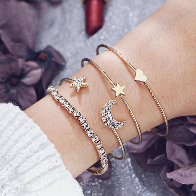 Stylish Studded Moon Star Heart Combo Of 4 Bracelet For Women And Girls. This Modern Stylish Bracelet Is Perfect To Your Fashion Jewellery Collection. These Are Also Ideal For Special Gifts For Girls For Birthday, Wife, Best Friend, Valentine Gifts For Girlfriend, Wedding Gifts And Anniversary Gifts.