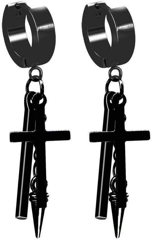 Stainless Steel Jesus Cross Tassel Urban Huggie Hinged Hoop Dangle Earrings Black For Mens & Womens Stainless Steel Huggie Earring