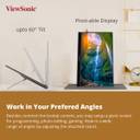 This ViewSonic VG1655 is a 16 (40.64cm) Full HD portable monitor featuring a portable structure with an adjustable wide stand, pivotable display, and a design prioritising reliability with an anti-slip cover, metal case, and aluminium stand. It offers audiovisual extension and power charging for USB-C mobile devices, allowing for simultaneous multimedia display and up to 60W charging via a single USB-C cable, with power input from an external source via a second USB-C cable. The monitor supports vertical layout for diverse tasks, comes with a magnetic cover that doubles as an anti-slip mat, and is environmentally sustainable with EPEAT Silver and ENERGY STAR certifications.