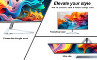 The monitor takes on an architecturally inspired design aesthetic fused with modern form factors such as a thin profile, modern frameless bezel, and a unique triangular stand.