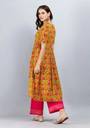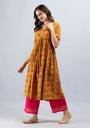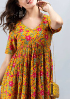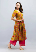 Crafted in an Anarkali style, this women's kurta and palazzo set offers a relaxed and flowing silhouette. The flattering V-neck and short sleeves provide breathability, ensuring comfort throughout the day. Furthermore, the empire-style waist enhances the shape, while the flared hem adds a graceful touch. Designed with an elastic waistband, the palazzo of this set ensures a flexible and secure fit for unrestricted movement.