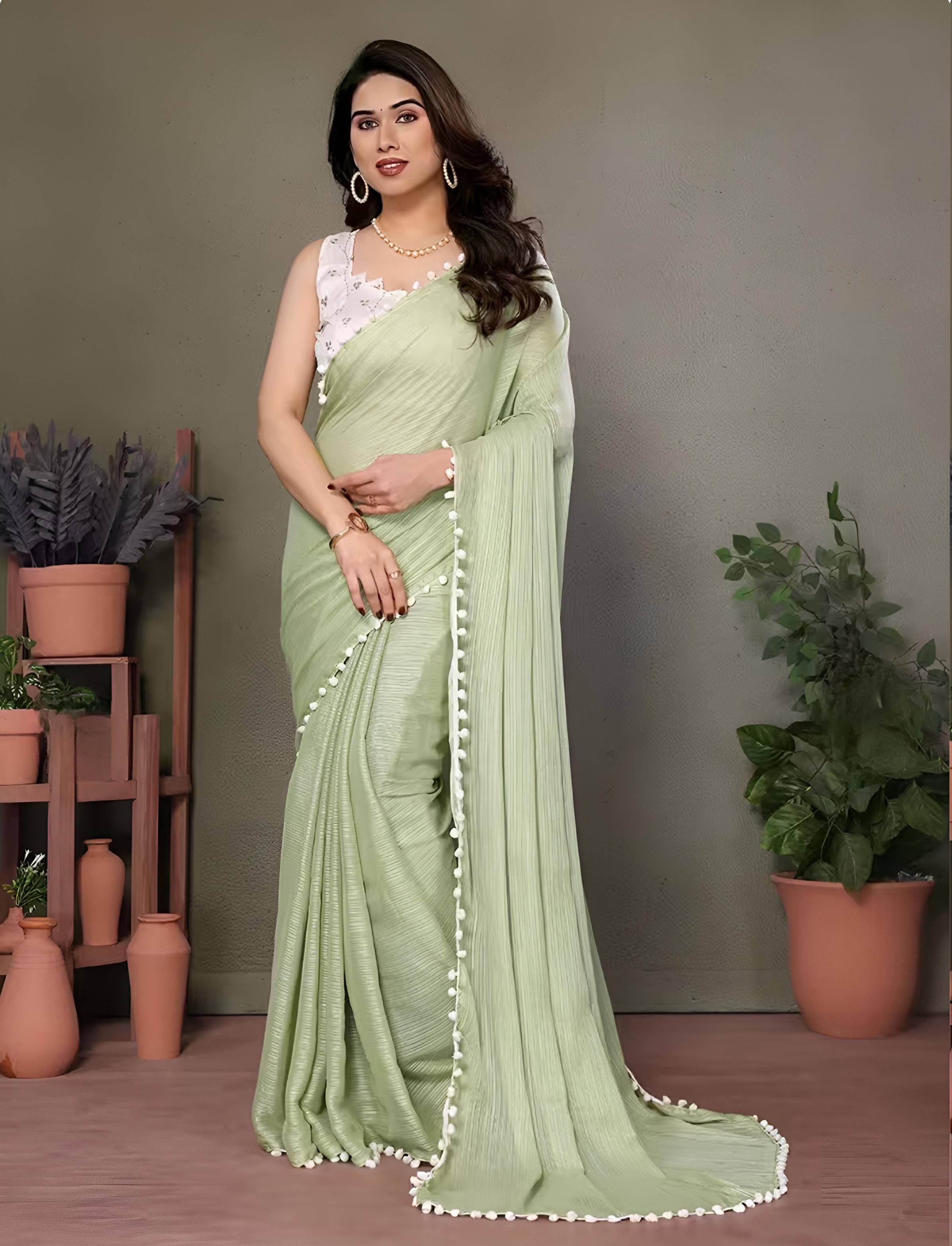 Enhance your ethnic wardrobe with this elegant Georgette Saree featuring a soft, flowy drape and beautifully crafted white pom-pom lace border. Designed for comfort and effortless style, this saree is perfect for festive occasions, casual outings, family functions, and daily wear. Paired with a stylish embroidered white blouse (as shown for reference), the saree offers a refreshing and youthful look. Its lightweight fabric ensures easy movement and all-day comfort.