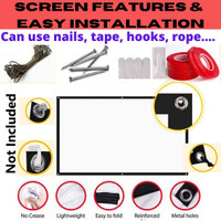 Featuring a user-friendly installation process, this projector screen includes nails, hooks, ropes, and double-sided tape for quick setup. Owing to these versatile options, you can easily mount the screen in various settings, whether in a school classroom or a conference room. So, during a busy work presentation, the straightforward installation saves you valuable time, allowing you to focus on delivering an impactful message.