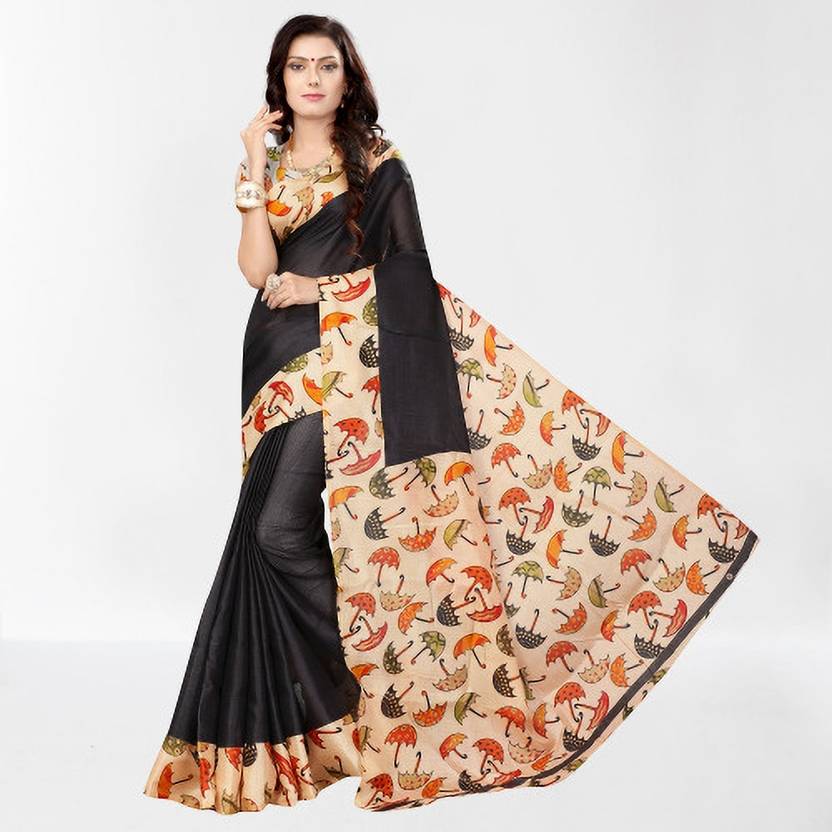 Vimalnath Synthetics Printed Kalamkari Cotton Blend Saree (Black)