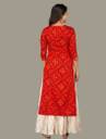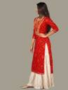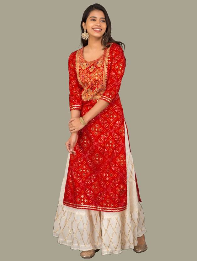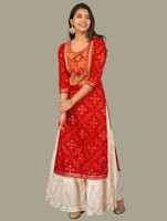 Featuring a Bandhani print pattern, this women’s kurta and sharara set adds a touch of cultural artistry to your wardrobe. The elaborate pattern creates a visual appeal that reflects traditional craftsmanship and elegance. Thus, ideal for those who appreciate authentic styles, this set is both eye-catching and classic, making it versatile for various occasions.