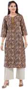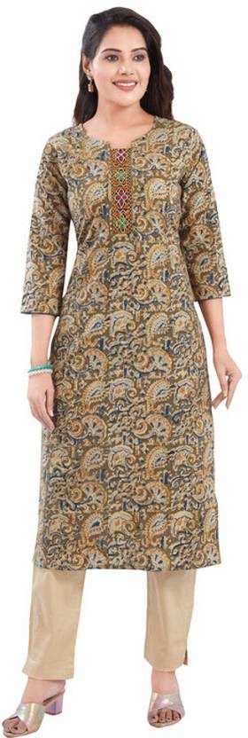 The Vismi Green Kalamkari Printed Cotton Kurti features vibrant, hand-painted Kalamkari art, bringing a unique cultural touch to your wardrobe. The handcrafted embroidery neckline adds an exquisite, eye-catching detail. For styling, pair it with white or contrast-colored leggings or palazzos, and accessorize with ethnic jhumkas and a sleek clutch for a stylish, festive look. Comfortable yet fashionable, this kurti is perfect for casual outings or special occasions. Organic Colors are used color may bleed while wash.