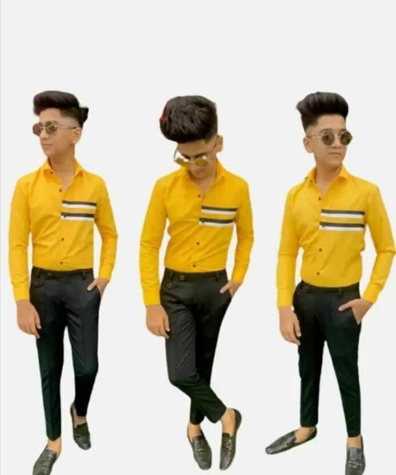 YELLOW SHIRT TOP, BLACK PENT BOTTOM