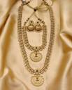 Designed to create an eye-catching look, this women's necklace and earrings set offers a detailed use of stone embellishments. The necklaces are layered to rest gracefully along the neckline, each accented with stones that reflect light and bring a subtle sparkle. Moreover, the jhumka earrings complement the necklaces with their traditional drop design. It is also adorned with stones that catch attention without overpowering the overall style.