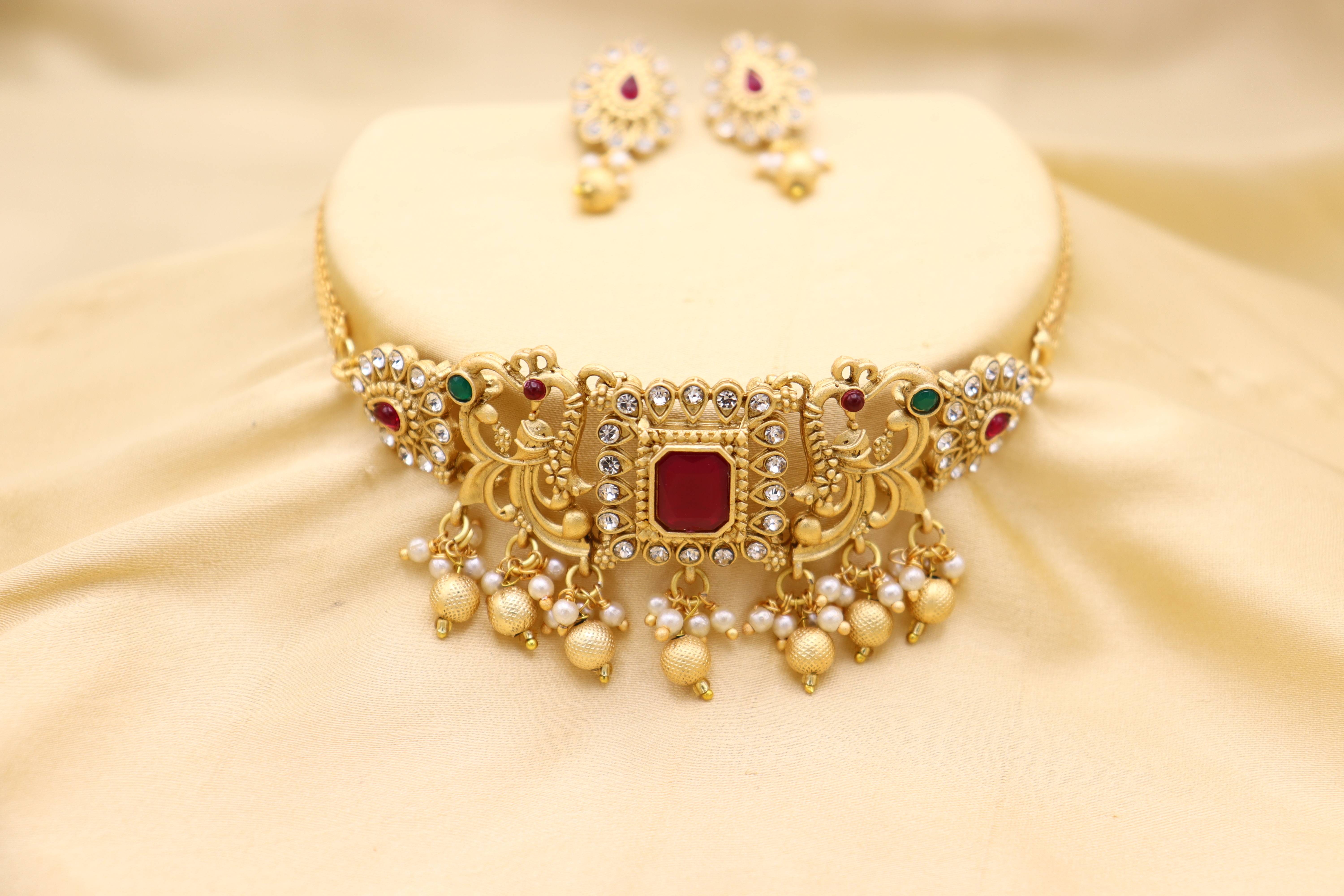 Base Metal: Brass & Copper Plating: Gold Plated Stone Type: Cubic Zirconia Sizing: Adjustable Type: As Per Image Net Quantity (N): 1 Vivanta design was manufacturer this jewelleryset Best quality ever and Gold-plated Matte bras drop Temple Style Choker set Country of Origin: India This lovely jewellery set from Vivanta has been exclusively designed for you. Any fabulous outfit is incomplete without matching jewellery. A woman is completely dressed with wearing matching jewellery. The best gift for someone special. Its graceful design complements with any ethnic or western outfit. Wear it on parties and special occasions and amaze everyone with your looks and it is easy and adjustable to wear according to the need and size. The Look is Stunning and Preciously Suitable for all Kinds of Dressy Occasions. Jewellery adds Lavishing look to any clothing. Vivanta always have their customer as preferential basis and works for customers No direct perfume, deo, water, and spray on the jewellery. First wear your makeup, perfume - then wear your jewellery. This will keep your jewellery shining for years. Please store in air-tight container. Do not store in velvet boxes