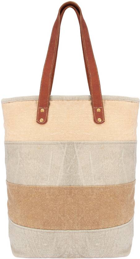 Distressed canvas tote bag with leather trims and brass accessories. Dyed/Stone wash to achieve vintage distressed look.