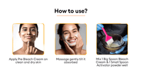 After mixing this bleach cream with this activator powder, you can apply the mixture to the desired area using a spatula. You can ensure to cover all hair strands except eyebrows and the eye area. After a specific time, you can rinse it off with cold water, pat the skin dry, and enjoy the instant golden glow. These skin-brightening bleaches are suitable for both personal and professional use, with each component securely packed.