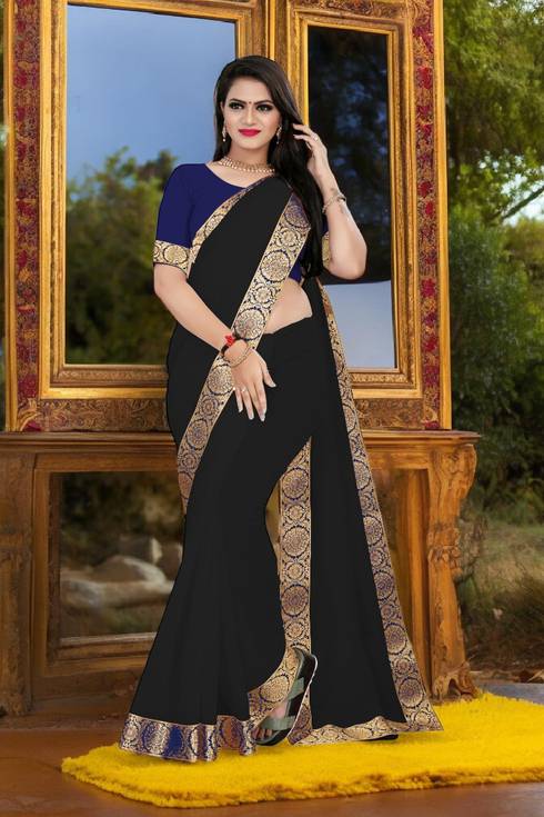 Volmina Solid/Plain Chanderi Cotton Blend Saree (Black)