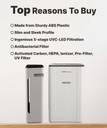 Featuring an ingenious 5-stage UVC-LED filtration system, this air purifier effectively removes airborne contaminants and impurities. The filtration stages include activated carbon, HEPA, ioniser, pre-filter, UV filter, and antibacterial filter, ensuring comprehensive purification of the air. Each filter works together to trap pollutants, dust, pollen, and other allergens, leaving behind only clean and fresh air for you to breathe.