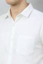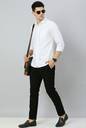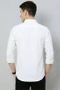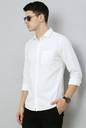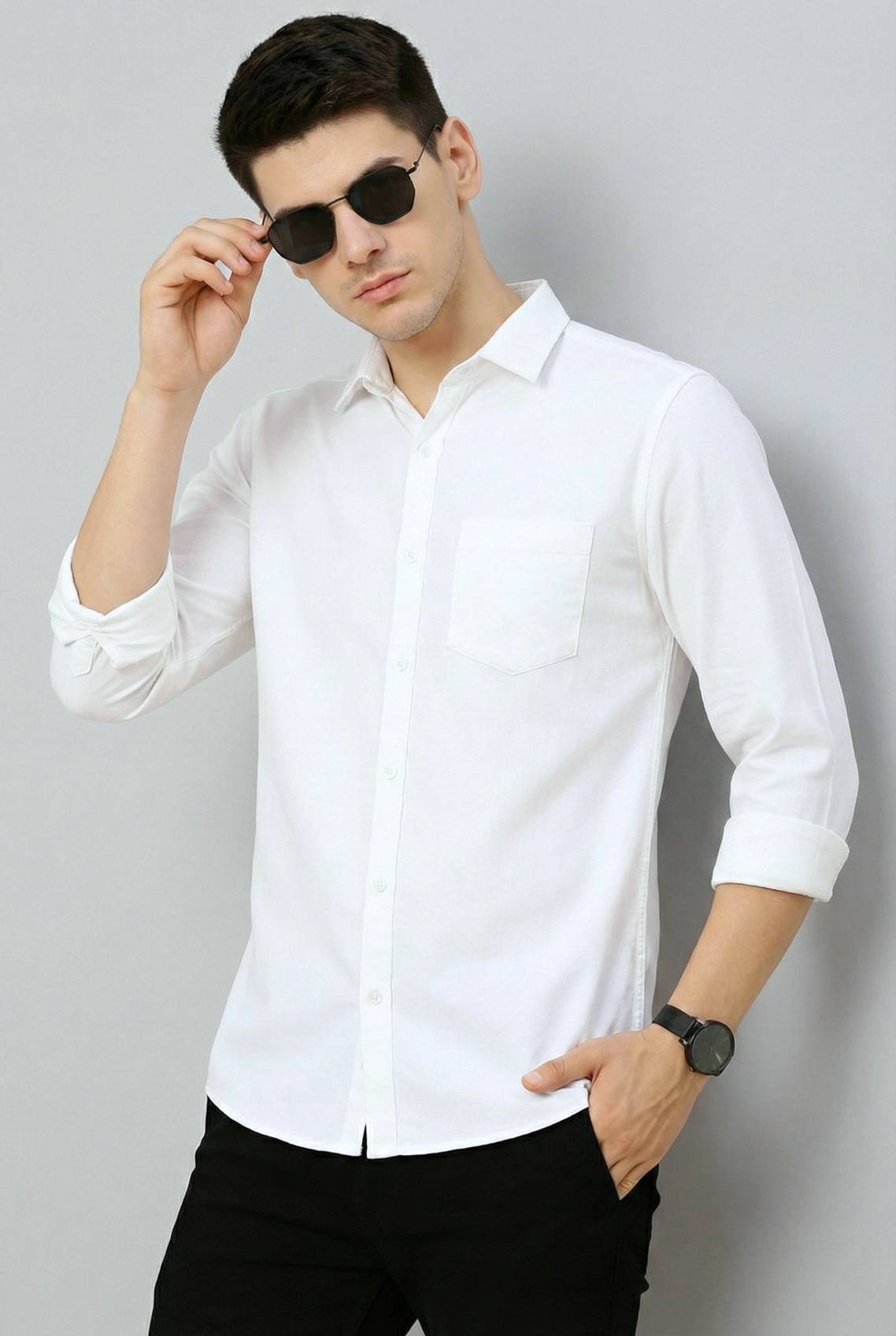 This is a plain white, full-sleeved shirt featuring a classic collar and a single patch pocket on the left chest. The sleeves are designed to be rolled up for a casual look. The shirt has a slim fit silhouette and is made from a solid fabric. It can be paired with black trousers, jeans, or chinos for a versatile look.