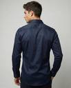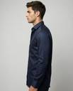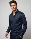 This is a navy blue long-sleeved shirt featuring a classic collar and a full button-down front. It includes a single chest pocket with a subtle embroidered 'V' logo. The fabric has a smooth texture and a slight sheen, giving it a refined appearance. The shirt is designed with a slim fit. It can be styled with matching trousers for a coordinated look or with jeans for a smart casual outfit.