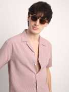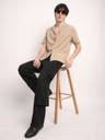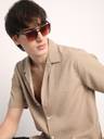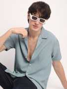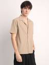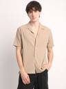 Khaki self design casual shirt, has a cuban collar, button placket, no pocket, half sleeves, straight hem, loose fit shirt, smooth and breathable fabric