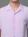 Lavender self design popcorn casual shirt, has a cuban collar and half sleeves, button placket, no pocket, open look, straight hem, loose fit shirt, smooth and breathable fabric