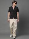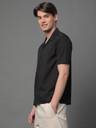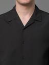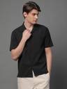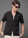 Black self design casual shirt, has a cuban collar, button placket, no pocket, half sleeves, straight hem, loose fit shirt, smooth and breathable fabric