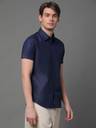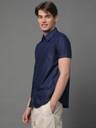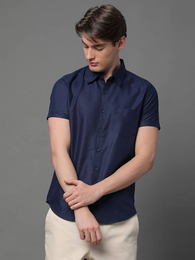 Navy Blue solid cotton blend formal shirt, has a spread collar, button placket, one patch pocket, half sleeves, curved hem, regular fit shirt, smooth and breathable fabric