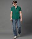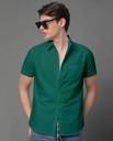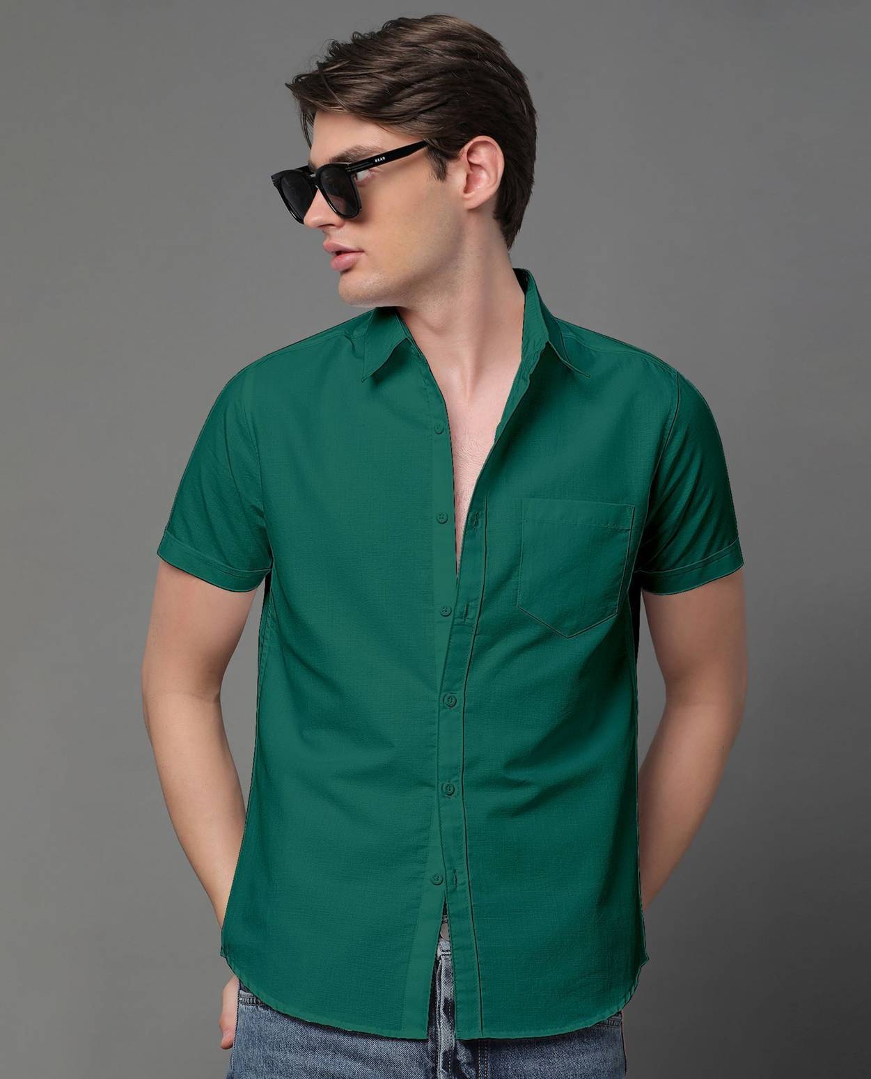 Bottle Green solid cotton blend casual shirt, has a spread collar, button placket, one patch pocket, half sleeves, curved hem, regular fit shirt, smooth and breathable fabric