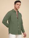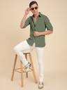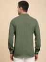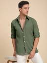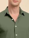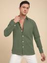 Olivegreen solid casual shirt, has a spread collar, button placket, no pocket, full sleeves, curved hem, loose fit shirt, smooth and breathable fabric