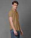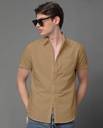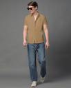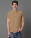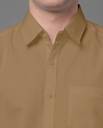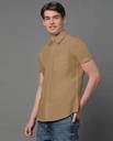Khaki solid cotton blend casual shirt, has a spread collar, button placket, one patch pocket, half sleeves, curved hem, regular fit shirt, smooth and breathable fabric