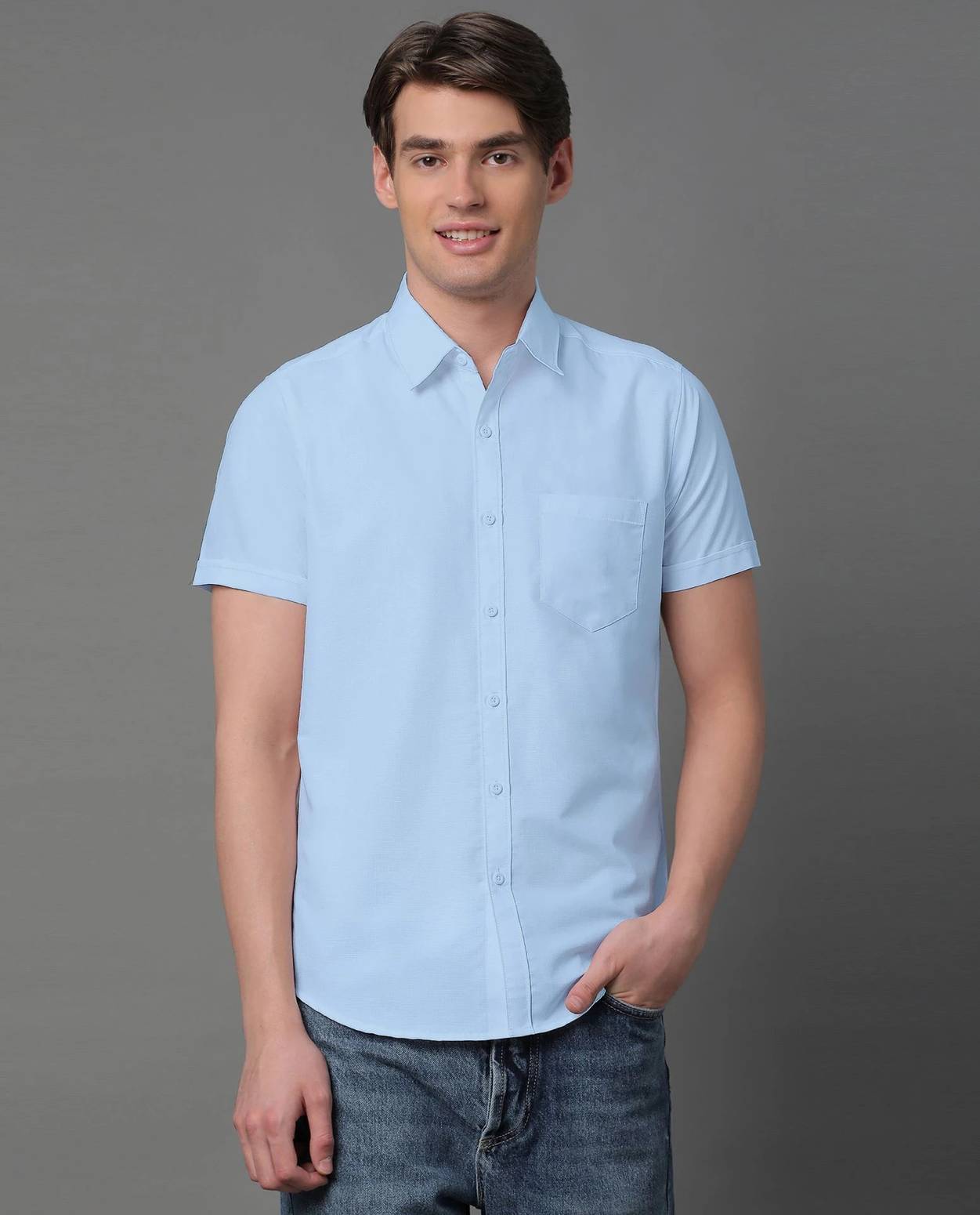 Sky solid cotton blend formal shirt, has a spread collar, button placket, one patch pocket, half sleeves, curved hem, regular fit shirt, smooth and breathable fabric