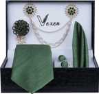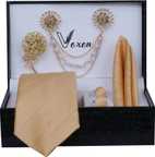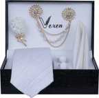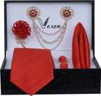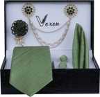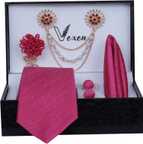 • 1 necktie, 1 Pocket square, 1 lapel brooch, 1 Flawer Brooch, & Cufflinks Pair with Gifted Box