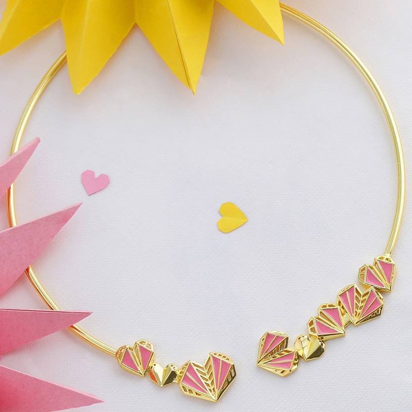 Geometric motifs, trendy open style necklace, inspired by the idea of celebrating the self this V-Day. Brass has been used in the making of this enameled and yellow gold plated necklace. Pair with a formal gown or even ethnic and Indo-Western wear.