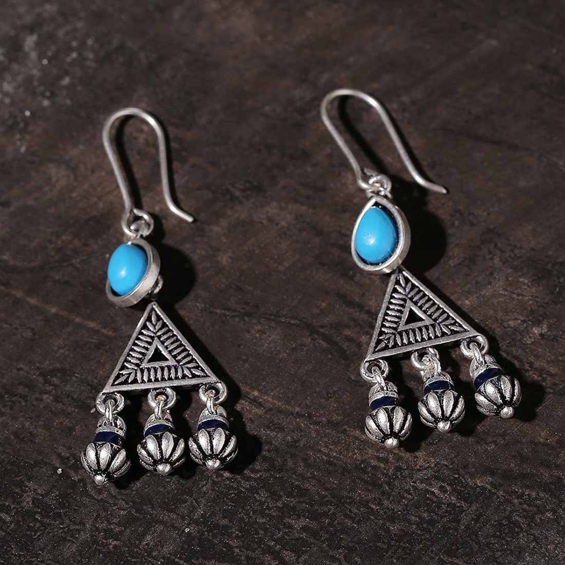 Lightly embellished triangles motif earrings inspired by mythology and related symbols. Made from brass and oxidised plated. Pair with ethnic attire.