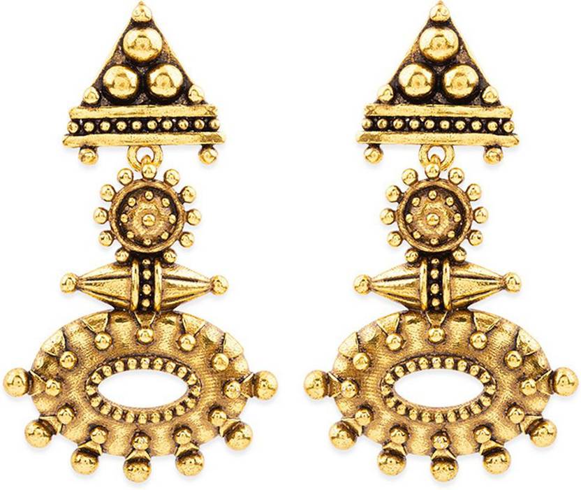 Add luster to your ethnic look by donning these trendy earrings. This brass pair has given an oxidized gold finish that gives out an exquisite sense of style. your simple kurta with a pair of these earrings.