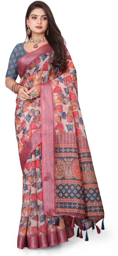 VPSLOENS Floral Print Bollywood Linen Saree (Multicolor)