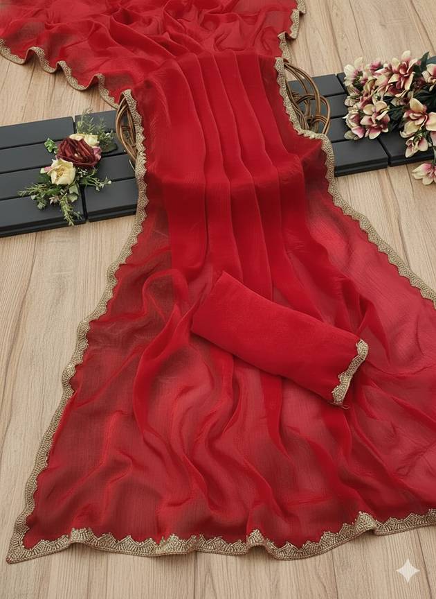HouseOfCommon Solid/Plain Bollywood Chiffon Saree (Red)