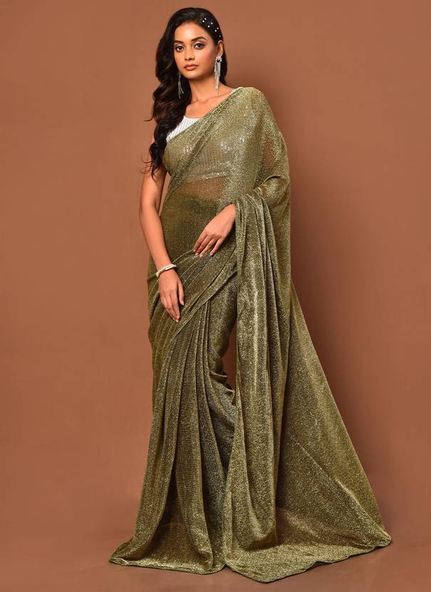 Vraggi Solid/Plain Bollywood Lycra Saree (Gold)