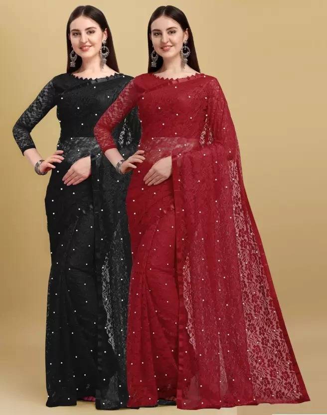 Vragi Self Design Bollywood Net Saree (Black, Maroon)