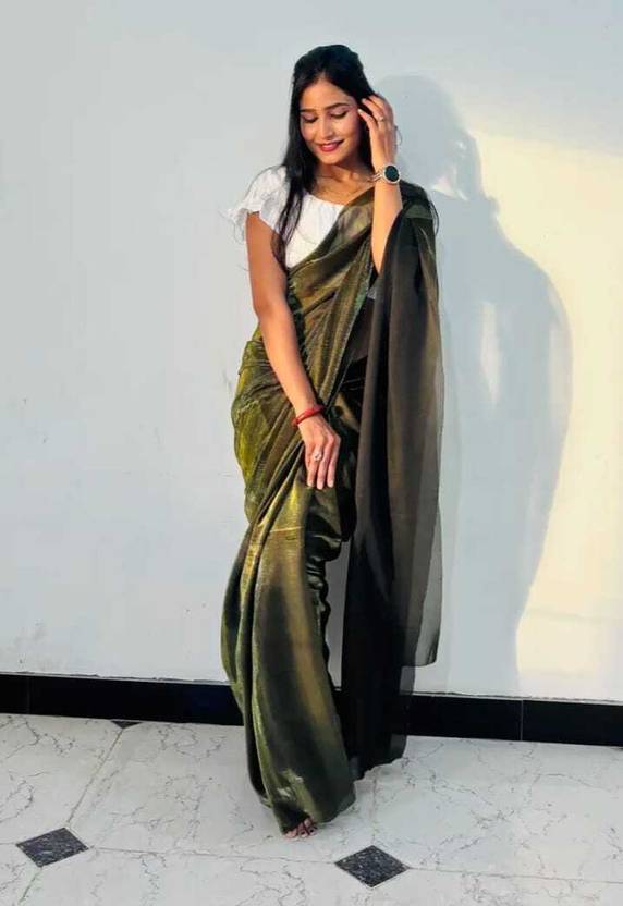 Vragi Solid/Plain Bollywood Lycra Blend Saree (Gold)