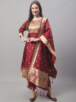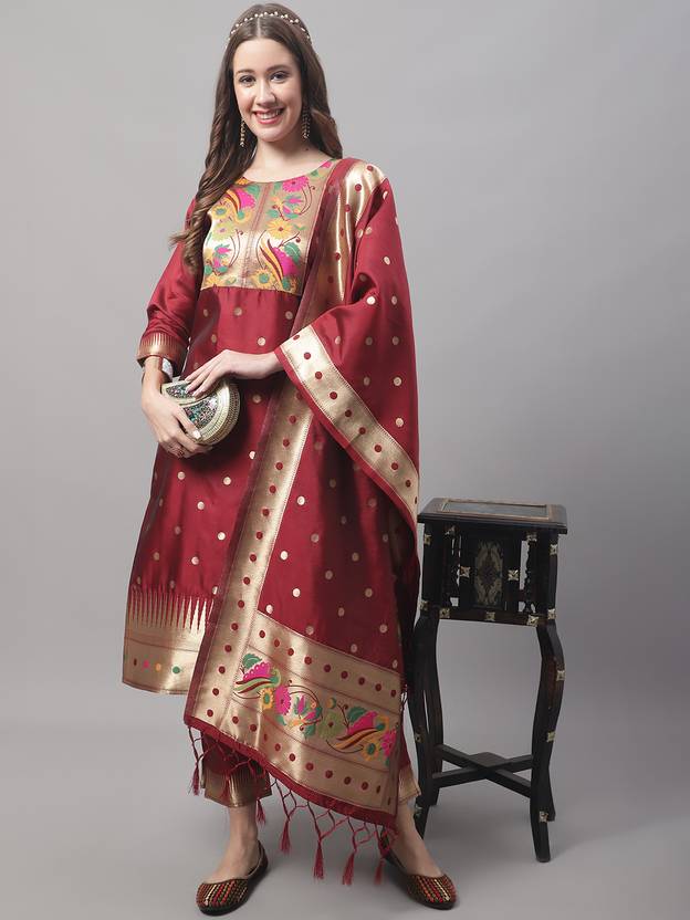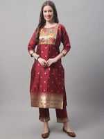 Set Type: Kurta With Bottom Wear With Dupatta Top: Cotton Silk Jacquard Kurta Length: 44 Approx Sleeves: Sleeve Length: 17 Inches Dupatta: Banarasi Silk 2.25 Meters Bottom Type: Pant Silk With Gotta Work Lace Pattern: Banarasi Woven Self Designed Multipack: 1 Kurta, 1 Pant, 1 Dupatta Care Instructions: Dry Clean Only Fit Type: Regular Fit Top Length: 44 to 45 Inches Approx, Sleeve Length: 17 Inches, Bottom Length: 37 Inches, Dupatta Length: 2.20 Meters Approx. Sizes: XS, S, M, L, XL, 2XL, 3XL