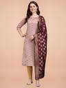 Sporting a round neck, a beautiful printed pattern, and contrasting embroidery detailing on the neck and sleeves, the VredeVogel Women’s Kurta and Dupatta Set offers an elegant design.