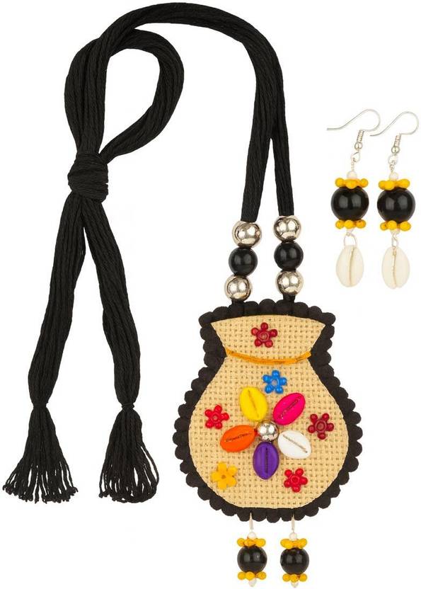 Add a touch of earthy elegance to your style with this beautifully handcrafted jewellery set. The necklace features a jute-inspired pendant decorated with colorful beads, mini cowrie shells, and floral embellishments, paired with matching earrings for a complete ethnic