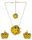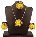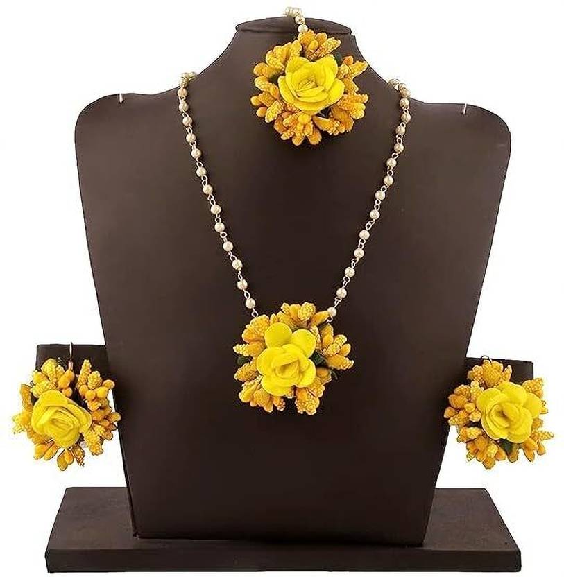 Flower jewellery then you are at the right place. We offers a wide collection flower jewellery. This yellow -green combination set is one of the jewellery pieces from Jewellery. It woven with good quality pearl beads & yellow flower. This necklace set is best pick for pre-wedding event such as ‘haldi’ & also for baby shower. It consists of necklace, pair of matching earrings, maang tika Set !!!!