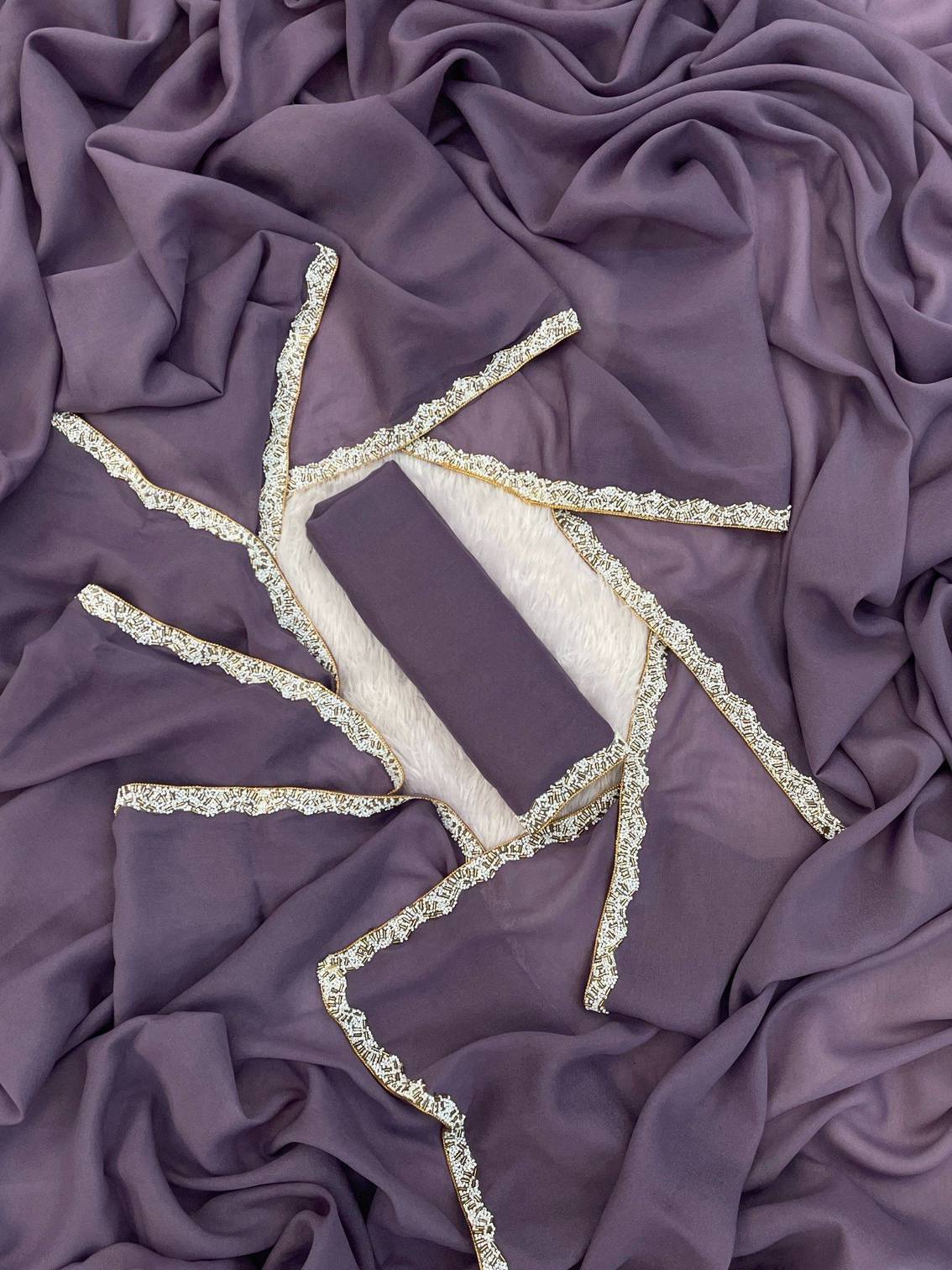 Gerogette Simmer Fabric Full Solid\ Plain With Small Moti Lace Side Border New Trending Saree