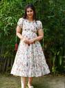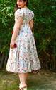 Fabric & Print: Light-colored base (white/cream) with an all-over floral print in multiple shades including red, yellow, blue, and green. The flowers are small and scattered, creating a delicate, garden-like look.
