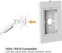 Sleek, secure, and durable. This Pad is designed for installing on a wall or can be mounted on a standard VESA monitor arm. An innovative internal design creates an all-in-one enclosure - compatible with most 9.7” to 11” tablets including iPad, iPad Air, iPad Pro, Samsung Galaxy Tab A, Tab A7 & Tab S6 Lite. Featuring an anti-theft lock and durable steel construction, it is safe and durable for high-traffic areas and public use.