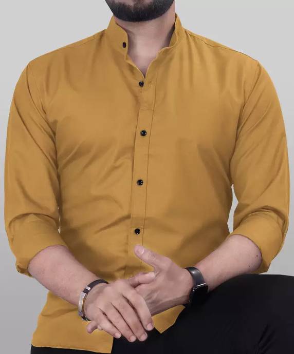Men Regular Fit Solid Mandarin Collar Casual Shirt