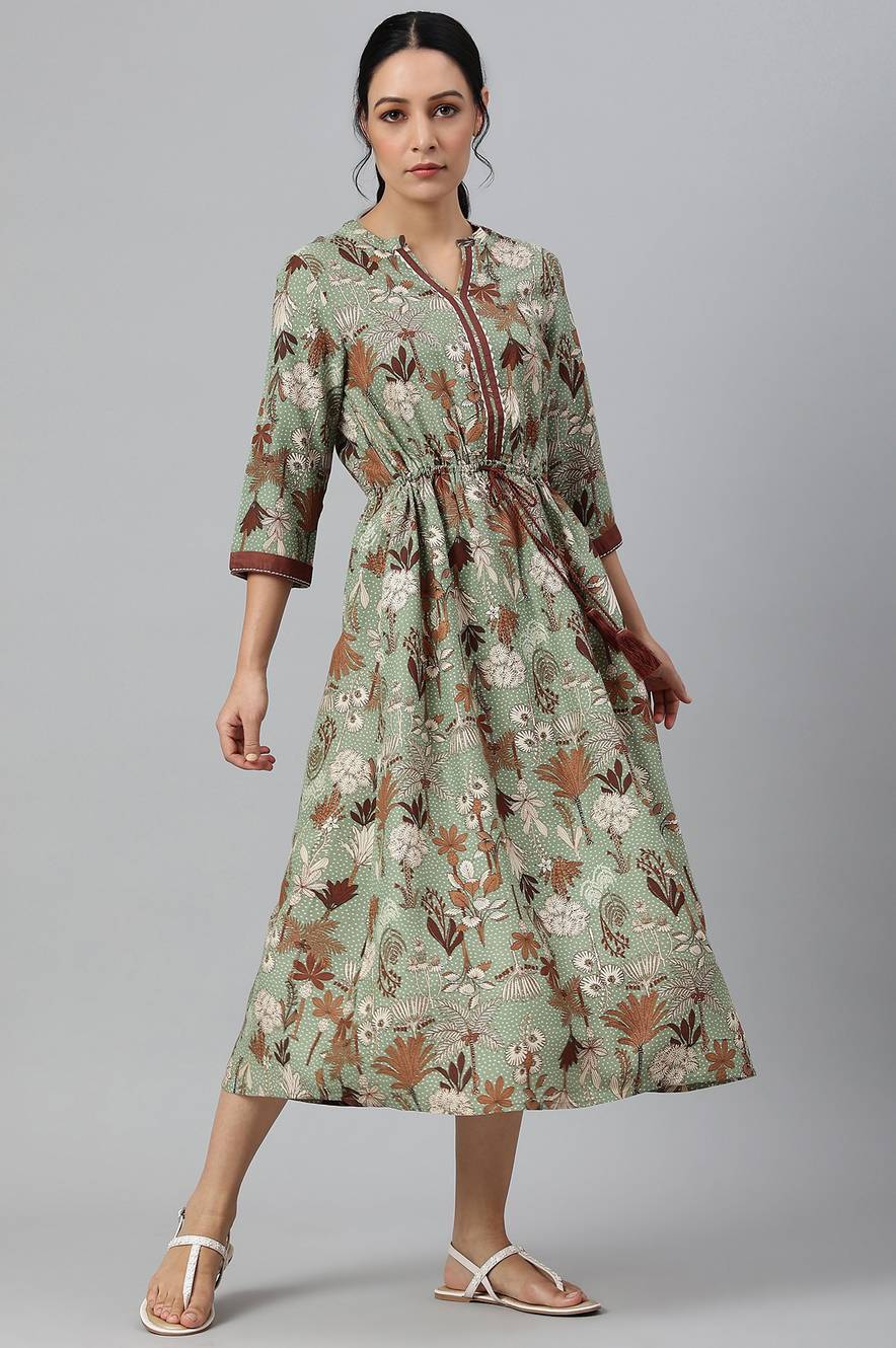 Garden Green Printed Flared Dress With Contrast Drawstring And Piping At Yoke And Minimal Detaling At Cuff And Yoke