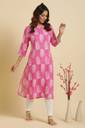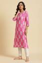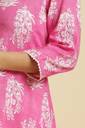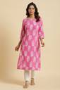 Crafted in rayon fabric, this pretty berry pink printed kurta can be your BFF this season. It features round neckline and three-quarter sleeves that are embellished with lace detail.