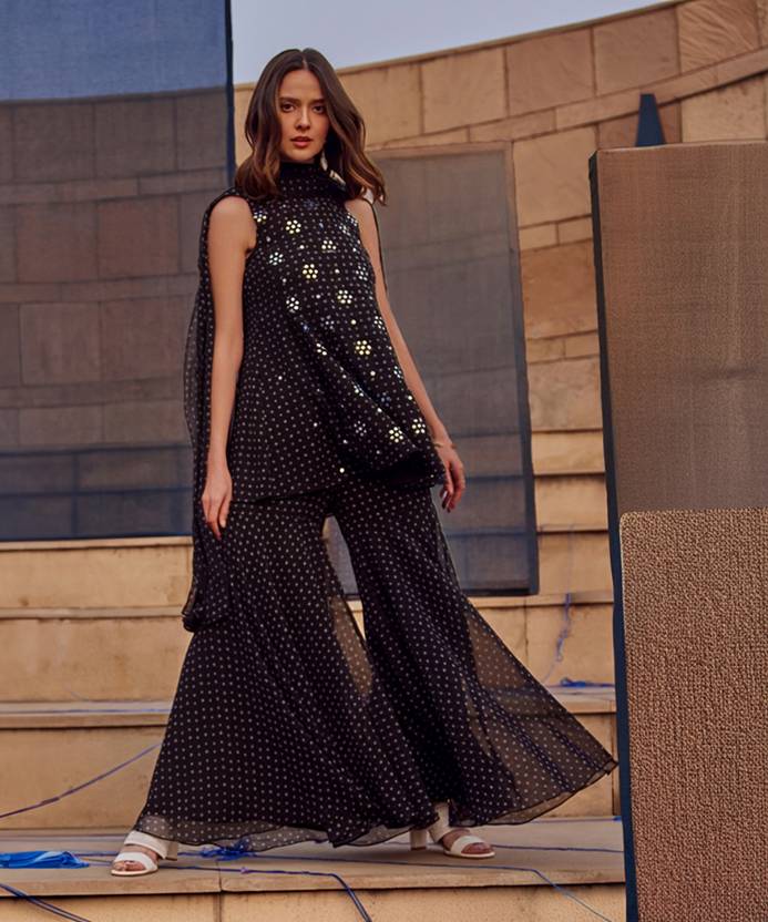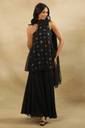 W Women Black Festive Geometric Print Georgette Kurta Set, Sharara & Dupatta